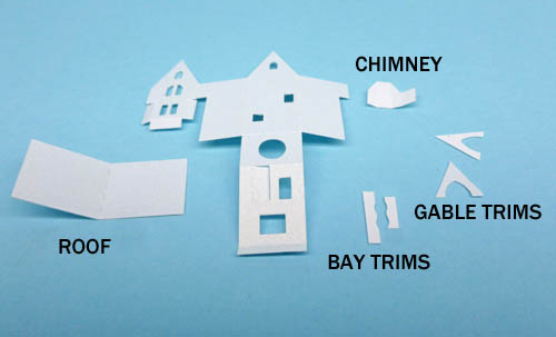 The two roofs and the chimney are folded and glued at this time. Be sure you press the folds flat at the upper section of the roofs for a nice crisp peak. You can fold, then unfold, sections and then fold in the next peak point to make this happen.