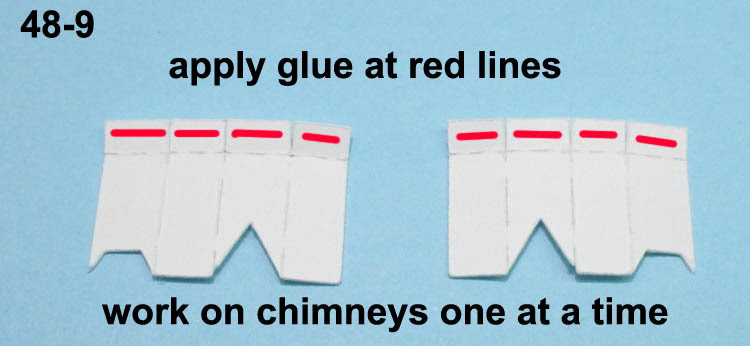 The last step for section 48-9 is to glue the chimneys in place. The side of the chimney with a small straight edge (as shown in the photo) is the one that drops down into the slot on the roof.